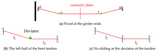 At the first stage, if there is no sliding between the tendon and deviator, the tendon is considered to be fixed at the fold point, as shown in Figure 2c. With a temperature change, the PVTC ( and ) of the tendon segments l1 and l2 can be expressed as follows: