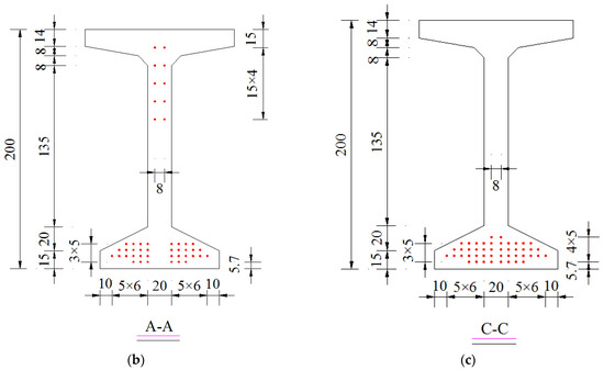 Arrangement of tendons (unit: 10−2 m). (a) Front view; (b) Section A-A (girder end); (c) Section C-C (mid-span).