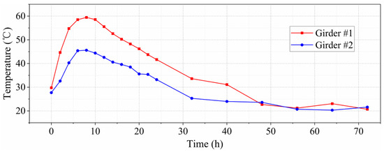 Girder #1 was cured under steam curing, with the corresponding temperature–time curve presented in Figure 7. Girder #2 was naturally cured.