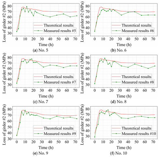 For Girder #2, the first stage is from −115 to 0 h, with the PVTC ranging from 20.8 to 28.2 MPa. According to material tests, the average initial setting time of concrete under natural curing is 10 h. The second stage is from 0 to 10 h, with the PVTC ranging from 32.7 to 44.4 MPa. According to the figure above, the prestress loss stabilizes after 72 h. The third stage is from 10 to 72 h, with the PVTC ranging from −8.8 to −16.5 MPa.