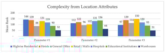 In the study by Ali and Suciana on house purchase decisions [], the three attributes identified and evaluated for influence on the decision were Location, Price, and Service Quality. Complexity is perceived to be higher where the location is more important, as prominent locations involve higher capital outlay and logistical challenges that increase project risk levels []. Similarly, complexity could still be higher in projects where scope and quality are essential as they demand better project design, higher quantum of scope, and stringent quality management. Finally, if the closeness to an infill location or city center is crucial for the project’s success, they do come with their execution complexity of logistics, space available for construction, adjoining developments, traffic restrictions, etc. [,]. Location is considered one of the critical indicators of complexity in many of the studies [,]. All these factors make a project relatively riskier if it has to be executed near the city center. Therefore, under location attributes, the complexity of building projects has been evaluated based on the importance assigned by the end-user to location over price (parameter 1), the importance assigned by the end-user to scope and quality over the location (parameter 2), and criticality of the facility is closer to the city center to be commercially successful (parameter 3).