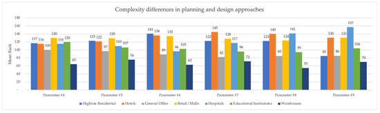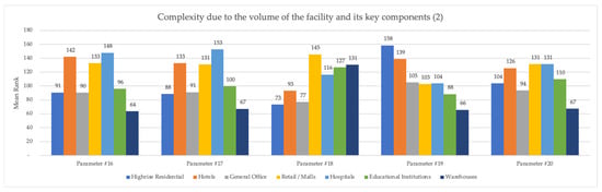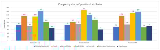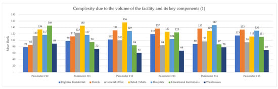 Finally, as a standard, each facility has a typical/preferred range of floor plates and height (number of floors). This differentiates each facility’s standard/typical volume, directly correlating with the complexity []. The Codal and Development Control Regulations applicable for each facility become stringent when the volume of people/users is high, making the development process complex. Based on the literature and discussion with the experts, under the volume of the facility, the complexity of building projects has been evaluated based on attributes such as occupancy density per 1000 square feet of usable area (parameter 10), number of parking spaces planned for every 1000 SFT of usable area (parameter 11), vertical transportation logistics complexity (parameter 12), the Scope of amenities within the project (as % of overall development in SFT) (parameter 13), installation of much electromechanical equipment as part of the scope (parameter 14), the level and intensity of safety and security, as part of the project design and scope (parameter 15), the scope, complexity, and intelligence of Building Management System (BMS) (parameter 16), the scope of integration represented by the number of sub-components of the project (parameter 17), building height used for setting up this facility (parameter 19), typical floor plate size of a standard building (parameter 18) and stringency of development control regulations and codal compliances (parameter 20) [].