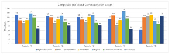 End users are the actual users of these facilities, and they play an impacting role in many of the developments. The involvement of the end user is not limited to changes in design but also includes their choices and preferences. Off-late ESG (Environmental, Social, and Governance) compliance is considered one of the essential compliance requirements for the developer by many international office clients []. There are situations where the end-user insists upon being built-to-suit. These are typically seen in anchor clients in large mall developments or office buildings. Ergonomics in operations is gaining momentum where user, usage, and operations are studied in detail, and facilities are designed to meet the requirements. Finally, the type of end-user also leads to complexity in development. Typically, if the end-user is a government body, they have non-negotiable standards and stringent contractual conditions and do not operate based on the relationship, making the whole development complex. Retail users are critical and noisy but have lesser contractual powers. So, the type of end-user has been included as one of the criteria for evaluating the complexity of the buildings. Relying on the literature review and inputs from the experts, the attributes such as the sensitiveness of the end users to ESG Compliance in the operation phase (parameter 21), the prevalence of end-user interference in the design and scope (parameter 22), the prevalence of built to suit and customization for the end users (parameter 23) and the critical nature of ergonomics in operations and the design (parameter 24), and type of client for whom the facility is developed (parameter 25) have been identified to evaluate the complexity from end-user attributes and powers.