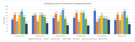 Based on the classification by O’Connor et al. [], the building projects chosen for comparison are high-rise residential buildings, hotels, general offices, retail buildings/malls, hospitals, educational institutions, and warehouses. Prior research on project complexity has been limited to factors causing it, impact analysis, how to measure it, and its management. Past research has focused on different frameworks and types of complexities within factors causing complexities [].