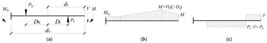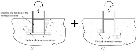 In the horizontal moment-resisting mechanism, as illustrated in Figure 1a, the concrete on the column side is compressed by the flange, leading to compressive deformation. The compressive stress is distributed on the upper part of one side of the embedded column and the lower part of the opposing side, creating a force couple that counteracts the external moment. Due to the equilibrium of shear forces, the compressive stress on the upper part has a greater magnitude and broader distribution compared to the lower part. Consequently, under the combined effects of moment and shear force, the embedded column exhibits both flexural and shear deformations.