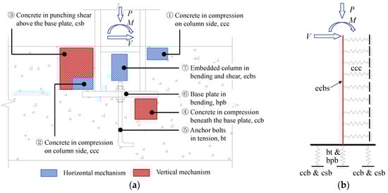 Drawing from the analysis of the moment-resisting mechanisms inherent to ECBs, they can be categorized into distinct force and deformation components. As illustrated in Figure 2a, the horizontal moment-resisting mechanism comprises two primary components: concrete in compression on the column side (ccc) and embedded column in bending and shearing (ecbs). In the vertical moment-resisting mechanism, the key components are concrete in compression beneath the base plate (ccb), concrete in punching shear above the base plate (csb), anchor bolts in tension (bt), and the base plate in bending (bpb).