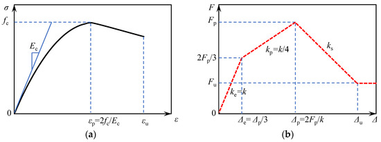The stiffness and strength of the compressive concrete per unit length are given by Equations (1) and (2), respectively. However, there is currently no available reference for the full-range load–displacement relationship. Here, referring to the form of the uniaxial compressive constitutive model of concrete, it is assumed that the load–displacement relationship of component ccc follows the same form. The Hogenestad model, which is adopted by concrete design codes in countries such as China, Europe, and the United States, is shown in Figure 3a. The ascending segment is a quadratic function, and the descending segment is a linear function. Its expression is as follows: