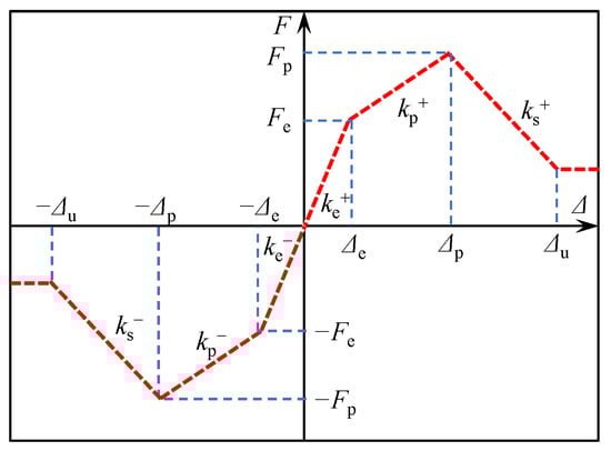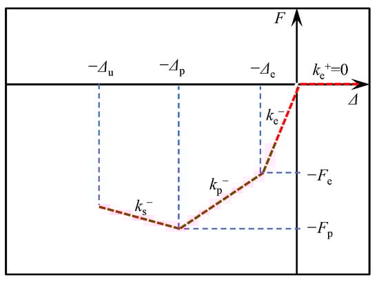 Assuming that the compressive behaviour of the equivalent T-stub also follows the aforementioned four-linear model and that this component cannot withstand tensile forces, the full-range load–displacement relationship is shown in Figure 7. The coordinates of the characteristic points are (−Δe, −Fe) = (−2Fp/(3ke), −2Fp/3), (−Δp, −Fp) = (−2Fp/ke, −Fp), and (−Δu, −Fu) = (−3.8Fp/ke, 0.85Fp).