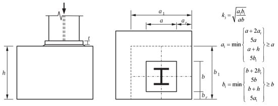 in which beff and leff are the effective width and effective length of the equivalent T-stub, respectively. For an equivalent T-stub composed of a column flange and a base plate, beff = tf + 2c and leff = bf + 2c, where c is the stress diffusion width and tf is the flange thickness. For an equivalent T-stub composed of a column web and a base plate, beff = tw + 2c and leff = hc − 2tf − 2c, where tw is the web thickness and hc is the column height. If the calculated results exceed the range of the base plate, only the area within the base plate range is effective. fj is the compressive strength of the concrete in the rigid region. kj is a concentration factor reflecting the edge effect, and the specific calculation method is shown in Figure 6. When the base plate is sufficiently far from the edge of the concrete foundation, kj = 5. βj is a reduction factor considering the quality of the bedding grouting. When the characteristic strength of the bedding is greater than 0.2 times the characteristic strength of the concrete and the thickness of the bedding is less than 0.2 times the minimum width of the base plate, βj = 2/3. If these conditions are not met, the performance of the bedding needs to be evaluated separately. c is determined based on the condition that the base plate just reaches bending yield under the compressive stress fj, i.e., 1/2fjc2 = 1/6tp2fy, in which fy is the yield strength of the base plate and tp is the thickness of the base plate. Then,
