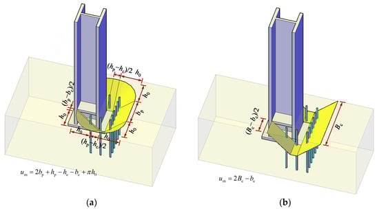 in which Fc,p and Fs,p represent the contributions of concrete and stirrup, respectively; h0 is the distance from the upper surface of the base plate to the foundation surface, i.e., h0 = detp; fyv is the yield strength of the vertical reinforcement around the column; Asvu is the total area of all vertical reinforcement intersecting with the 45° punching shear failure cone; and um is the calculated perimeter, taken as the average of the top and bottom perimeters of the punching shear failure cone. Influenced by the foundation width (Bc), two possible failure surfaces for punching shear can occur, as shown in Figure 8. The smaller calculated perimeter of the two punching shear failure surfaces is taken as um: