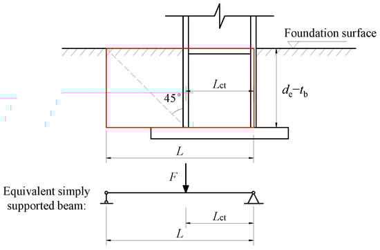 For the initial stiffness, Zhao et al. [12] simplified the concrete block subjected to the uplifting effect of the base plate on the tensile flange side as an equivalent simply supported beam, as shown in Figure 9. Here, L represents the equivalent beam length, Lct represents the distance between the mid-surfaces of the flanges on both sides of the steel column, and the equivalent beam width is taken as the column width bc. Considering shear and flexural deformations, the initial stiffness can be calculated by: