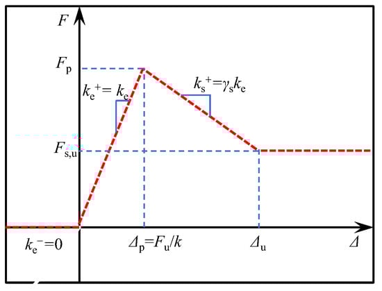 For ease of application, the load–displacement curve is simplified into a four-linear curve, as shown in Figure 3b. According to the principle of energy equivalence, the elastic limit Fe is taken as 2/3Fp, and the corresponding plastic stiffness kp is equal to 1/4ke. Referring to the concrete constitutive model, Δu and Fu are equal to 1.9Δp and 0.85Fp, respectively. Additionally, since uniformly distributed springs placed on one side are used to represent the compressive behaviour of the concrete on both sides of the column, the full-range tension-compression behaviour of the springs can ultimately be represented by the curve shown in Figure 4.