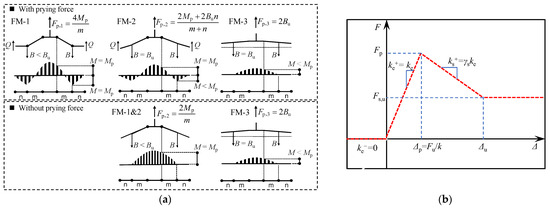 in which the three terms in the first function min() correspond to three typical failure modes when there is a prying force, while the two terms in the second function min() correspond to two typical failure modes when there is no prying force, as shown in Figure 11a; Mp (=fylefftp2/4) is the plastic moment of the base plate section within the effective length; Bu is the tensile strength of the anchor bolts; Ab is the cross-sectional area of the anchor bolts; Lb is the effective length of the anchor bolts, taken as eight times the diameter of the anchor bolts plus the total thickness of the grouting layer, base plate and washer, as well as half the height of the nut and bolt head; and parameters m and n are geometric parameters, and their values can be referenced in Eurocode 3.