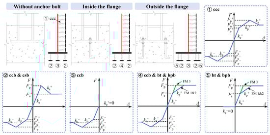 When different components can be represented by springs located at the same position below the base plate, the behaviour of these components can be combined. For example, the components csb and ccb (on the flange side) can be represented by a spring with tension-compression asymmetric behaviour located below the flange. Similarly, the anchor bolt located in the middle of the base plate and the component ccb (on the web side) can also be represented by a spring with tension-compression asymmetric behaviour located below the web. Figure 12 shows the component models for ECBs with different configurations of the base plate and the constitutive models of the equivalent springs.