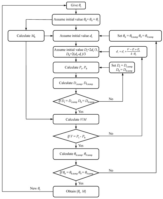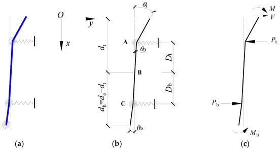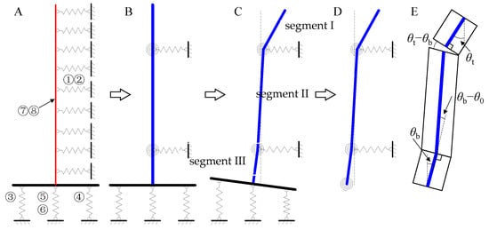 As shown B in Figure 13, the distributed bearing stress on both sides of the embedded column can be equated to two concentrated forces. The upper concentrated force acts at the position where the moment in the cross-section is maximum; hence, it is assumed that the bending deformation is concentrated at this position. The shear force in the cross-section between the upper and lower concentrated forces is maximum and constant, so it is assumed that the shear deformation occurs uniformly between the two concentrated forces. Finally, as shown C in Figure 13, the embedded column is divided into three segments based on the positions of the equivalent concentrated forces. Each segment is represented by a rigid rod, and relative rotation can occur between them. The bending and shear deformations of the embedded column are concentrated and represented at the rotation points. As shown in E in Figure 13, the difference between the rotation θt of segment I and the rotation θb of segment III, i.e., θt- − θb, represents the difference in rotation at the two ends due to bending deformation. The relative rotation θbθ0 between segments III and II represents the rotation of the column’s central axis caused by shear deformation. Therefore, the relative rotation θtθ0 between segments I and II is the sum of the rotation caused by both bending and shear deformations.
