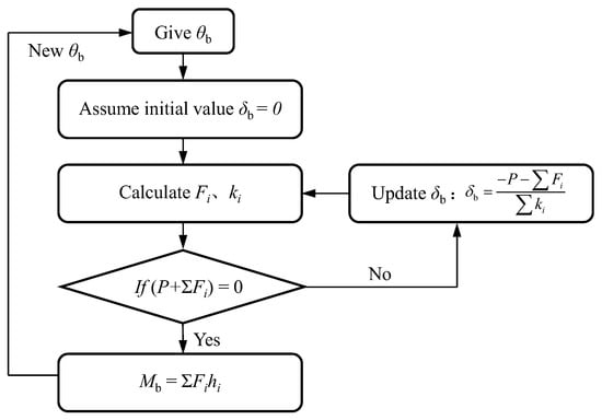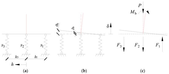 Under the moment Mb and axial force P, the deformation of the base plate is uniquely determined by rigid-body axial displacement and rotation around a certain point, as shown in Figure 14b. Theoretically, this point can be located anywhere, but for the convenience of establishing equations, the intersection point of the neutral axis of the steel column and the base plate is chosen. Denoting the rigid-body displacement and rotation as δb and θb, respectively, and the springs from right to left as s1, s2, …, with the vertical distance from spring si to the neutral axis being hi, the axial deformation of spring si (tension is positive) is:
