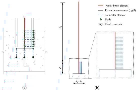 Based on the identification of components, Figure 2b presents an idealized mechanical model. In this framework, component ccc is represented by horizontal springs evenly distributed along the embedded depth on one side, illustrating the nonlinear response of compressive concrete per unit height. The component ecbs is depicted as a Timoshenko beam positioned at the column’s axis, incorporating both flexural and shear deformations. The base plate is substituted with a rigid rod, securely fastened to the beam representing the embedded column. The components ccb and csb are denoted by vertical springs centred at the flanges on each side. The components bt and bpb are symbolized by springs at the bolt’s axis. Due to the complex interaction between the tensile anchor bolt and the flexural base plate, it is challenging to describe their uniaxial behaviours separately. Following the recommendations of Eurocode 3, they are combined into a spring, with a T-stub method employed to determine their combined uniaxial behaviour. Similarly, due to the complex interaction between the base plate and the bearing concrete, they are equated to a T-stub in compression to determine uniaxial behaviour. The determination of the load-deformation relationships of these components will be presented in Section 3.