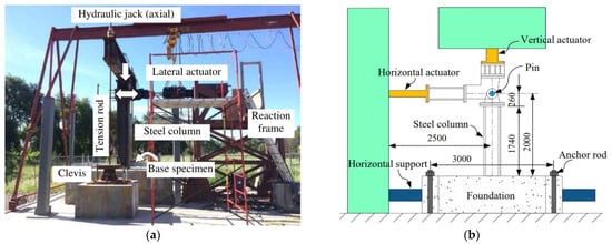 ECBs are typically considered to be fixed due to their substantial stiffness, achieved through sufficient embedded depth. This rigidity often leads to the neglect of their non-rigid behaviours, such as rotation and energy dissipation capacity, in structural analysis. However, recent experimental studies [2] showed that ECBs could exhibit significant flexibility. Under design moments, the rotation of ECBs can reach 0.4% to 0.8% rad. This flexibility may increase the bottom layer’s story drift by 20–30% compared to the drift under the assumption of a fixed connection. Inamasu et al. [3,4] found that, at a story drift ratio of 4%, the axial residual deformation of the steel column, taking into account the actual rotation of the ECB, was reduced by 30% to 60% compared to the results under the assumption of a fixed connection. However, this reduction was accompanied by an increase of 40% to 50% in lateral deformation under the same load. Thus, reasonable utilization of ECB’s deformation and rotation can delay local buckling in wide flange columns and reduce axial residual deformation at the same story drift, enhancing seismic resilience and speeding post-disaster repairs. Additionally, for larger steel columns, a deep embedding requirement often results in higher foundation heights, increasing construction costs. Consequently, shallow ECBs with smaller embedded depths have garnered scholarly interest [5]. Cui et al. [6,7] and Richard et al. [8] investigated the hysteretic behaviour of exposed column bases with a floating concrete slab on top (which can be considered shallow ECBs), and significant rotation was observed. Therefore, accurately evaluating the flexural performance of ECBs, including initial stiffness, moment resistance, and full-range behaviour, is crucial for considering the nonlinear interaction between steel columns and foundations in structural analysis.