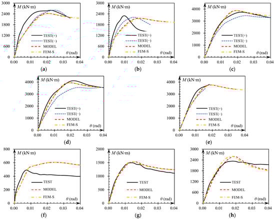 in which fc is the concrete compressive strength, and β is a coefficient that accounts for the enhancement effect of the surrounding concrete confinement on the compressive strength. According to the suggestion of Grilli and Kanvinde [20], β is taken as two, as verified by the comparison between the test results and model predictions of ECBs’ moment resistances. This value is also consistent with those adopted by Mattock and Gaafar [37], Deierlein et al. [38], and Sheikh et al. [39], and it has subsequently been codified in the ASCE Guidelines for composite connections [40].