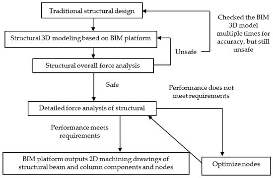 The specific integrated design methodology and steps are as follows: initially, Tekla Structures is employed to construct a three-dimensional (3D) model of the steel structure. Subsequently, SAP2000 is utilized to conduct a comprehensive structural analysis of the 3D model, encompassing load-induced stress analysis as well as elastic-plastic dynamic time–history analysis. If the overall structural stress meets the requirements, ABAQUS 6.14 software is then employed for the detailed analysis of the prefabricated steel structure node models, focusing primarily on the collapse resistance performance of node. Should these nodes satisfy the stress criteria, SolidWorks is used to generate two-dimensional (2D) fabrication drawings for the optimized nodal components of the prefabricated steel structure, while Tekla Structures produces 2D fabrication drawings for the beam and column elements. In instances where the detailed analysis of the prefabricated steel structure’s nodes does not fulfill the stress requirements, the nodes are redesigned according to the analysis outcomes until they meet the necessary stress criteria.