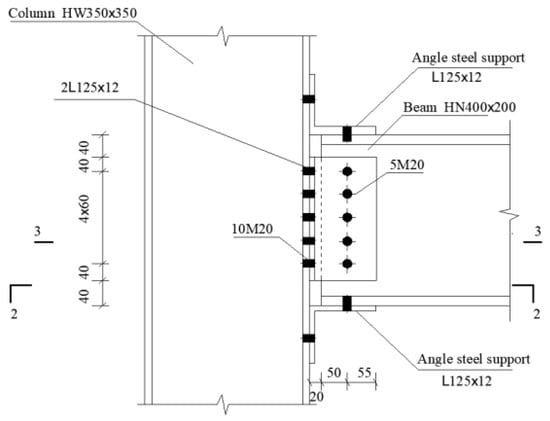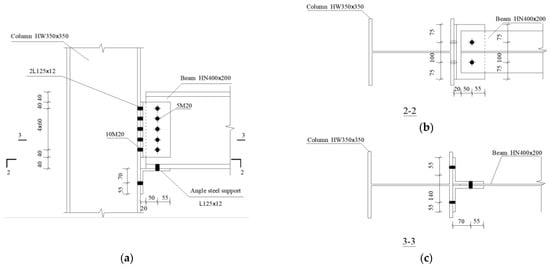 Figure 3. The steel frame columns adopt a cross-section of HW350 × 350 × 12 × 19, while the frame beams use HN400 × 200 × 8 × 13 sections. All steel materials are of grade Q345B. Beam-to-column connections are achieved through web stiffener angles combined with base plate angles. High-strength bolts, with a diameter of 20 mm, are used throughout. Detailed diagrams of the connections are shown in
