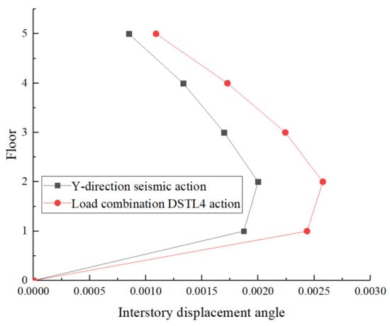 The maximum inter-story drift angle of this structure occurs at the second floor under load combination DSTL4, with a value of 0.002576, which is less than the elastic inter-story drift angle limit of 0.004 required by the Code for Seismic Design of Buildings [
