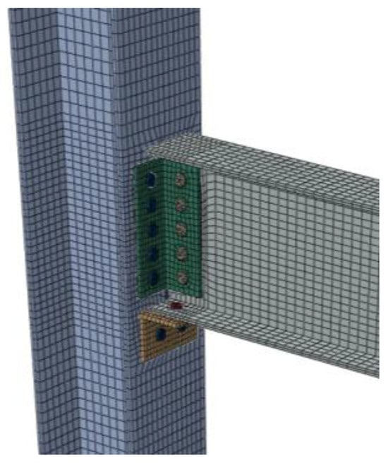 Considering the inadequate vertical load-bearing capacity of the web double-angle steel plus base plate configuration, an additional angle steel connector is added to the upper flange of the beam, thereby designing the beam–column node connection as a dual-web angle steel and dual-flange angle steel configuration, as depicted in