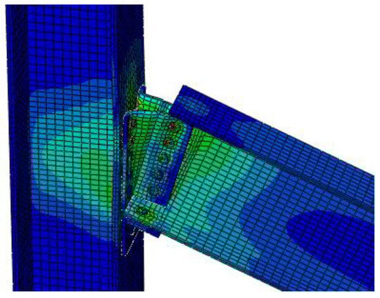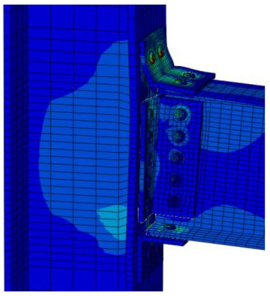 The stress contour map of the beam–column joint with web double-angle steel plus base plate angle steel is shown in