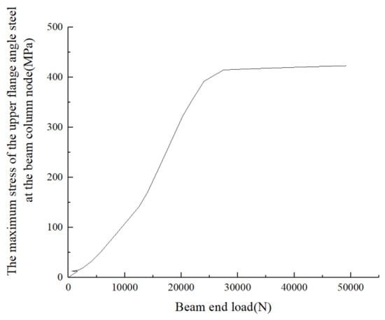 Figure 27 illustrates the relationship between the end load of the beam and the maximum stress in the upper flange angle steel of the beam–column joint.