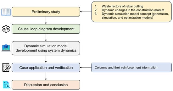 Figure 1 represents the methodology taken in this study to achieve the mentioned objectives. A comprehensive literature review investigated waste factors in rebar cutting, dynamic changes in the construction market, and the dynamic simulation model concept. Key findings from relevant studies were also incorporated. Based on this review, a causal loop diagram was developed to represent the system dynamics related to rebar-cutting waste. Subsequently, a dynamic simulation model was constructed using system dynamics principles, guided by the developed causal loop diagram. This model allowed engineers and researchers to observe whether near-zero rebar-cutting waste was achieved. If the initial simulation resulted in non-optimal waste levels, the researchers iteratively adjusted the minimum rebar quantity and available rebar length, re-ran the simulation, and analyzed the impact on waste generation. This iterative process ensured that the cutting waste was maintained at near-zero rebar-cutting waste conditions.