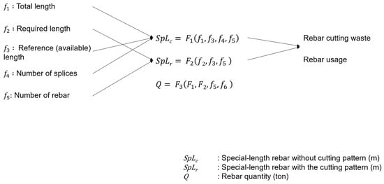 Figure 2 depicts the generation model, which assesses the rebar-cutting waste considering the identified factors. Recognizing that the near-zero rebar-cutting waste strategy consists of two parts (special-length-priority without cutting pattern for continuous reinforcements and special-length-priority with the cutting pattern for remaining reinforcements), the model considers these factors: total rebar length, required rebar length, reference (available) length, number of splices, number of rebar, and unit weight of rebar. These factors denoted as f1, f2, …, and f6, are then incorporated into formulas to calculate rebar-cutting waste. Thus, the model effectively maps the relationship between each factor and the resulting rebar-cutting waste.
