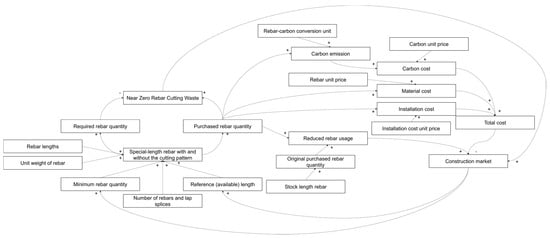 As shown in Figure 5, the near-zero rebar-cutting waste upon the reduction of waste and purchased rebar quantity is shown through a special-length-priority algorithm with and without the cutting pattern. However, its effectiveness is significantly constrained by these minimum requirements applied by the steel mills: (1) reference (available) rebar length and (2) minimum rebar quantity. As noted earlier, these requirements can dynamically change due to construction market volatility, which is closely linked to global economic conditions. A recent example illustrating this dynamic is the global economic crisis induced by the COVID-19 pandemic. Policies and regulations implemented to control movement and goods during the pandemic severely disrupted the global supply chain, negatively affecting the economy [,,,,,]. In response to these challenges, enterprises, such as steel mills, adopted mitigation strategies including production reduction, cost optimization efforts, and adjustments to minimum order requirements (either tightening or lessening), considering the level of disruption. As the economy recovers, these minimum requirements may be adjusted. The previous Section identified several key factors affecting rebar-cutting waste, including total rebar length, required length, available length, number of splices, number of rebars, and unit weight. This study focuses on employing special-length rebar minimization for continuous (without cutting pattern) and remaining rebars (with cutting pattern) to achieve near-zero cutting waste. Consequently, in Figure 5, both total rebar length and required rebar length are represented by rebar lengths to reflect the application of special-length rebar minimization. Furthermore, most of the links are assigned to positive polarity except for the required rebar quantity and total cost.