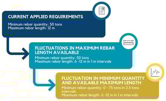 The effectiveness of the special-length rebar approach is constrained by the steel mills’ procurement minimums, which depend on the construction market’s conditions. This market is influenced by global economic, geopolitical, and technological factors, as well as unforeseen events like the recent COVID-19 pandemic, which significantly altered the economic landscape. Policies and regulations implemented to control the movement of people and goods have had adverse effects on the economy and critically disrupted the global supply chain [,,,,,]. This disruption is not a novel occurrence, as the 2007/2008 financial crisis also precipitated similar global supply chain disruption, as observed in Australia []. This can lead to material shortages, as evidenced by a report of scarcity in India []. The ensuing economic downturn and fragile finances exacerbated the condition, resulting in recessions in several countries []. Severe recessions were also observed during the 2007/2008 global financial crisis. Evidence from both Malaysia and Singapore, where project numbers have decreased and owners postponed initiatives due to the pandemic [,,], led to the demand decrease for construction materials. In response to economic challenges and movement restrictions, enterprises, including steel mills, implemented strategies such as reducing production, cost optimization, and adjusting minimum requirements based on the disruption’s severity. As the economy recovers, these requirements may change. With advancing technology and growing interest in sustainable construction, the demand for green buildings may lead steel mills to ease their minimum requirements. Therefore, engineers must account for these market changes in real time to achieve near-zero cutting waste effectively.