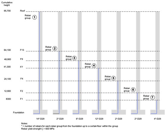 Rebar groups with a similar total length in a continuous column (adapted from []).