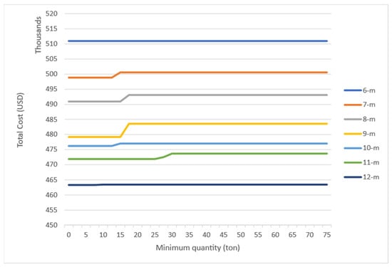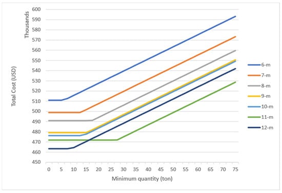 In the third scenario, the impact of dynamic fluctuations in the construction market and global economic situation was investigated by considering variations in both the minimum order quantity and the maximum available rebar length for special orders. The minimum quantity ranged from 0 to 75 tons in increments of 2.5 tons, while the maximum rebar length varied between 6 and 12 m in 1 m increments. The developed model was iterated numerous times to determine optimal solutions for each combination of minimum quantity and maximum rebar length. Figure 9 and Figure 10 present the simulation results, including cutting waste generation and total cost. For detailed results, refer to the attached supplementary data [].