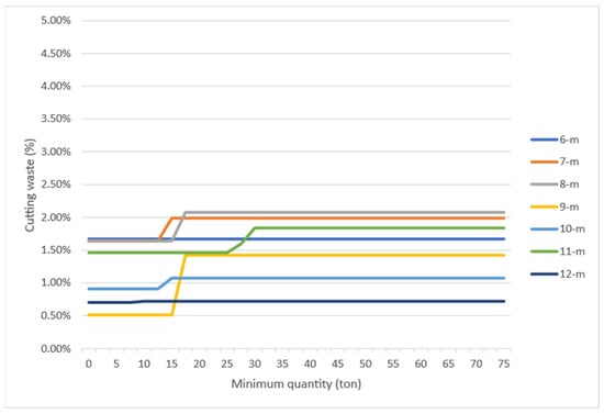 The model developed in this study simulates each scenario elaborated in the previous Section. The first scenario serves as the baseline where the current requirements for purchasing special-length rebar are assumed to be applied with a minimum rebar quantity of 50 tons and a maximum available (reference) length of 12 m. In the second scenario, the maximum available rebar length (reference) is assumed to fluctuate between 6 and 12 m in 1 m increments, while the minimum order quantity remains at 50 tons. The third scenario assumes a fluctuation in both minimum quantity and maximum rebar length available for special orders, with the quantity varying from 0 to 75 tons, 2.5-ton intervals, and the length ranging from 6 to 12 m in 1 m intervals. Moreover, the rebar waste rate is targeted under 20% to capture the impact of such fluctuations. The rebar-cutting waste was calculated using Cutting Optimization Pro following Equations (11)–(16). Meanwhile, the simulations are conducted using Microsoft Excel.