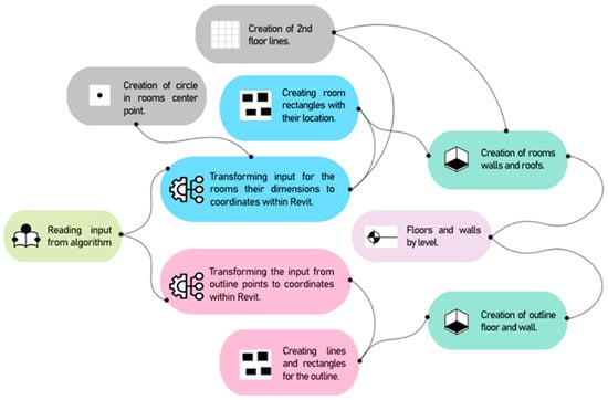 The integration of Dynamo within Revit enables the creation of a streamlined workflow for generating optimized 3D BIM visualizations and enables designers to automate repetitive tasks, manipulate complex geometries, and perform data-driven design. The script developed in Dynamo interprets the output from the optimization algorithm, importing relevant data into Revit, and generating a 3D BIM model, as illustrated in Figure 3. The Dynamo script has been included in Appendix A. With the ability to modify design parameters and explore different design options iteratively, designers can optimize layouts and evaluate their impact on various factors such as space utilization, circulation flow, and accessibility. The visual programming script employed in this study follows the subsequent steps:
