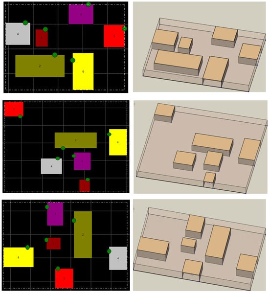 Layout planning (LP) plays a crucial role in optimizing space utilization within a building or facility and minimizing total space requirements. Hospital layout planning (HLP), a specialized form of LP, focuses on designing efficient layouts for healthcare facilities [,]. Researchers have investigated different methods to optimize the layouts of healthcare facilities. For instance, Chraibi et al. [] implemented intelligent decision systems to optimize healthcare processes and improve the efficiency of staff at an operating theater. They utilized PSO to achieve nearly optimal layouts for large-sized instances.