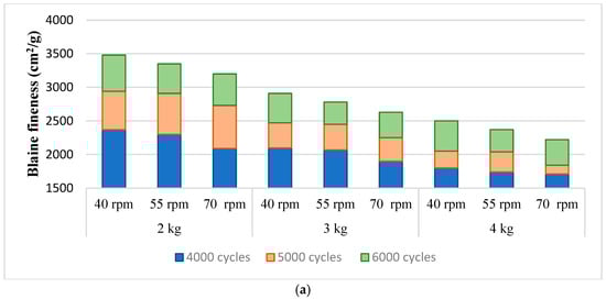 Figure 2 shows that increasing the mill speed from 40 rpm to 55 rpm results in only minor differences in the Blaine fineness of cements, ranging from 1 to 4%, regardless of feed rate, ball distribution, and number of revolutions. At a grinding speed of 70 rpm, compared to 55 rpm, the Blaine fineness of the cements decreased by 5–12%, 4–16%, 5–9%, 3–10%, 6–9%, and 4–10% for ball distributions No. 1, 2, 3, 4, 5, and 6, respectively, after grinding at 4000 cycles. Thus, at 70 rpm, which is 90% of the critical mill speed, the grinding performance decreased. Similar results have been reported by many researchers [14,25,26]. As the rotational speed of the mill increases, the balls rise higher in the mill and fall from that point. They grind the feed at the places where they fall by impact and abrasion. This movement is called “cataract”, and this movement causes the formation of a coarser product [21].