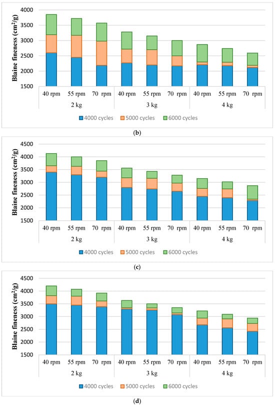Blaine fineness values of cements produced under different grinding conditions. (a) Ball distribution no. 1, (b) ball distribution no. 2, (c) ball distribution no. 3, (d) ball distribution no. 3, (e) ball distribution no. 5, (f) ball distribution no. 6.