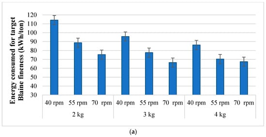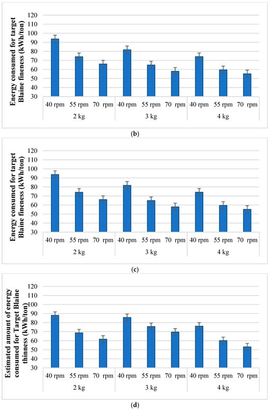 Amount of energy consumed to achieve the target Blaine fineness value (3700 ± 100 cm2/g) for cements produced under different grinding conditions. (a) Ball distribution no. 1, (b) ball distribution no. 2, (c) ball distribution no. 3, (d) ball distribution no. 3, (e) ball distribution no. 5, (f) ball distribution no. 6.