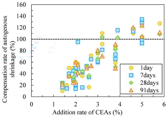- The addition of CEAs is positively correlated with the compensation rate for autogenous shrinkage of HSC/UHSC within a certain range. Within the data range investigated in this study, incorporating more than 4% of a calcium-based EA can nearly achieve zero shrinkage or slight expansion in HSC/UHSC.