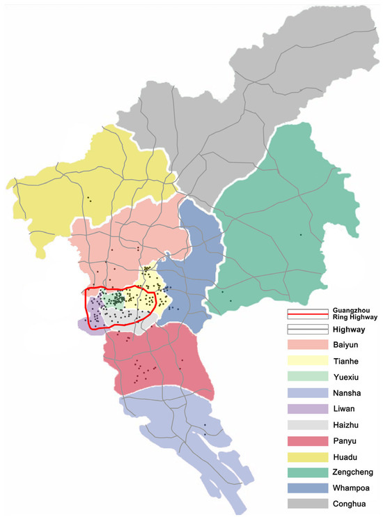 The research objects were randomly sampled and distributed in and around the core area as evenly as possible. A total of 373 bus shelters were selected. The proportion of bus shelters distributed in Baiyun District, Tianhe District, Yuexui District, Nansha District, Liwan District, Haizhu District, Panyu District, Huadu District, Zengcheng District, and Huangpu District is 6%, 26%, 25%, 1%, 13%, 12%, 9%, 1%, and 1%, respectively, as shown in Figure 2. Among them, the gray line is the highway, the red line is the Guangzhou Ring Highway, and the black spot is the location of the bus shelter for research.