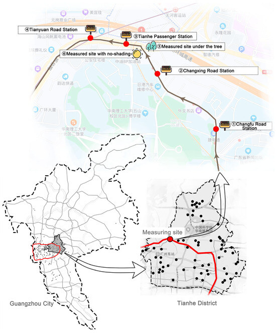 All the measured points are located in Tianhe District. The survey route and the distribution of measured points are shown in Figure 4. The bus shelters of Changfu Road Station, Changxing Road Station, Tianhe Passenger Station, and Tianyuan Road Station are the measured points of ①, ②, ③, and ④, respectively, while the measured points of ⑤ and ⑥ are the measured point under the tree and the measured point with no shading. Figure 5 shows the real images of the measured points.