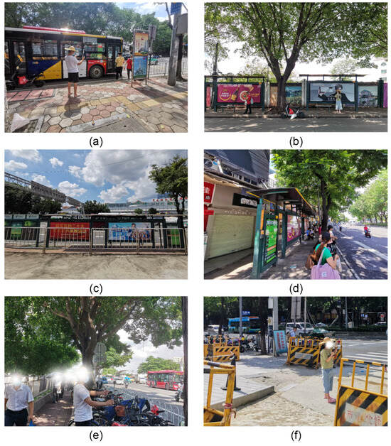 The measured sites, bus shelter in (a) Changfu Road Station, (b) Changxing Road Station, (c) Tianhe Passenger Station, (d) Tianyuan Road Station, (e) measured site under the tree, (f) measured site with no shading.
