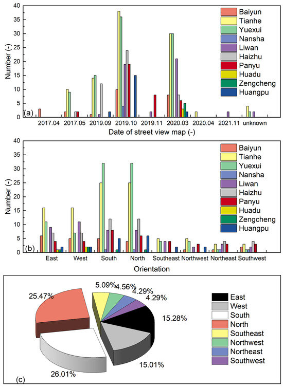 The statistics of shooting date and orientation of bus shelters, (a) shooting date of Street View map, (b) orientations of bus shelters in different districts, (c) proportion of bus shelter orientations of Guangzhou.