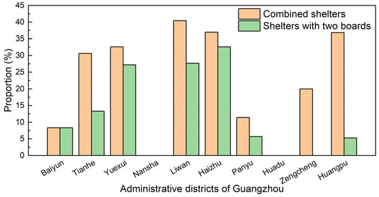 As illustrated in Figure 7, the combined bus shelters in Tianhe District, Yuexiu District, Liwan District, Haizhu District, and Huangpu District all account for more than 30%. The distance between the public phone booth and the bus shelter is relatively close, so the public phone booth should also be included when counting the number of boards. The bus shelters in the core area generally have boards at both ends of the platform to facilitate passengers to watch bus information, such as Yuexiu District, Liwan District, and Haizhu District, where bus shelters with boards at both ends account for 27%, 28%, and 33% of the number of shelters in the area, respectively. In suburban areas, however, combination shelters and bus shelters with bus boards at both ends are rather insignificant. With regard to the thermal environment, the bus boards can provide a shading effect, thereby enhancing the thermal comfort of people. However, in suburban areas, there is typically greater tree coverage than in urban areas [25], so it is acceptable for suburban areas to build bus shelters without boards.