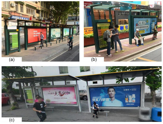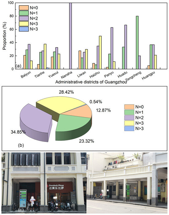 The number of roofs of 373 bus shelters in Guangzhou were counted, and the number of public phone booths were ignored. The results are shown in Figure 8a,b. It can be found that different bus shelters with a different number of roofs in Liwan District almost have the same proportion. The reason is that Liwan District is an old city with a large number of arcade buildings, and the waiting area is below the arcade building [26]. As a result, extra roofs and backboards are not necessary to offer shade for the people waiting, as shown in Figure 8c. Therefore, Liwan District has a larger proportion of uncovered bus shelters than any other district.