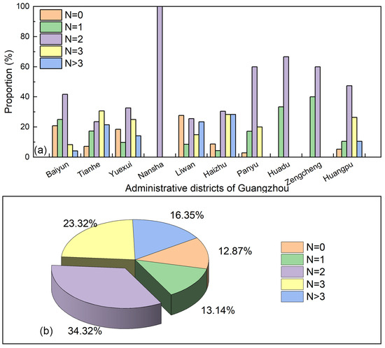 (a) Proportion of bus shelters with different number of roofs (including public telephone booths) in different districts, (b) proportion of bus shelters with different number of roofs (including public telephone booths) in Guangzhou.