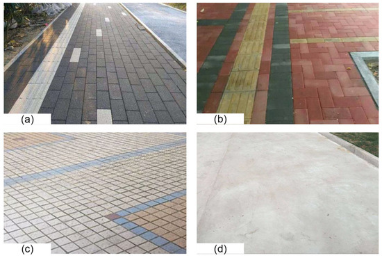 The different types of underlay surfaces of investigated bus shelters, (a) gray permeable brick, (b) red permeable brick, (c) impervious brick, and (d) cement.